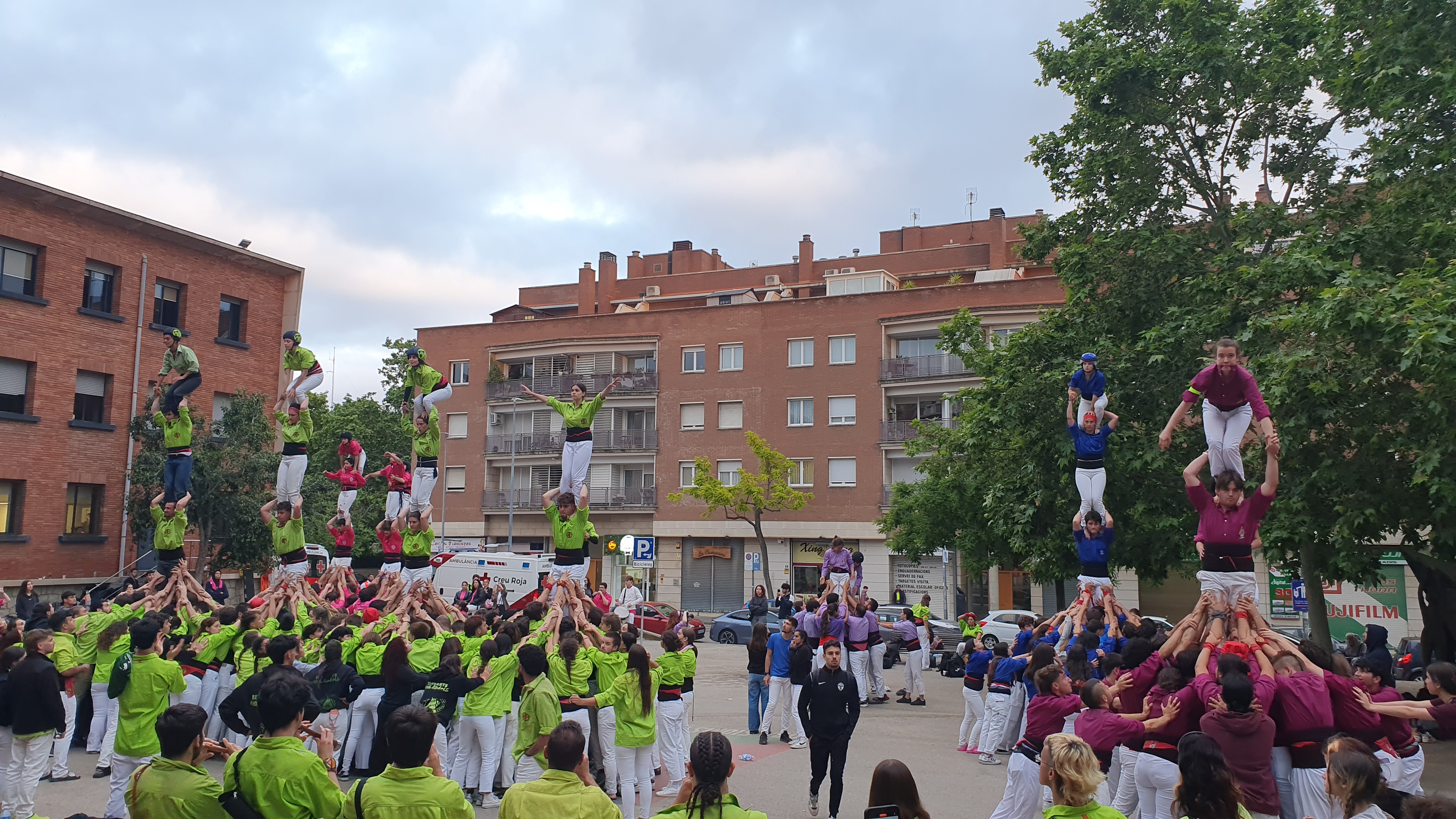 French and Spanish students shared meals and laughter, attended training sessions with other castells groups, and even met the mayor of Terrassa. Together, they helped raise towers of all shapes and heights, practiced climbing with their Catalan peers, and watched breathtaking public performances by the official Castells de Terrassa association, reaching up to eight or nine levels high.