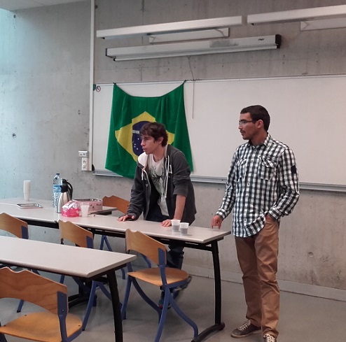 Une dizaine d'étudiants ont participé à ce premier Café, motivés par l'envie d'en savoir plus sur un pays qu'ils aimeraient potentiellement découvrir lors d'une future mobilité. Luis Felipe et Fernando, avec la complicité d'Alice et Pedro, étudiants de 4e année en échange à l'Esisar, ont su les faire voyager outre-atlantique sur un mode très convivial. Drapeau brésilien et carte du pays sur leur tablette à l'appui, l'interactivité était au rendez-vous. Les questions ont fusé : "Vous venez d'une université publique?", "Comment fonctionne le système des lycées?", "Et le coût des logements?". Les étudiants brésiliens ont su donner un aperçu de la vie brésilienne, dans ses aspects pratiques, autant que culturels et gastronomiques (à retenir : le barbecue en France ne vaudrait pas les "churrasco" (BBQ) du Brésil... avis aux amateurs! Il nous faut des volontaires pour comparer!). Obrigado à nos Brésiliens pour ce café rondement mené!