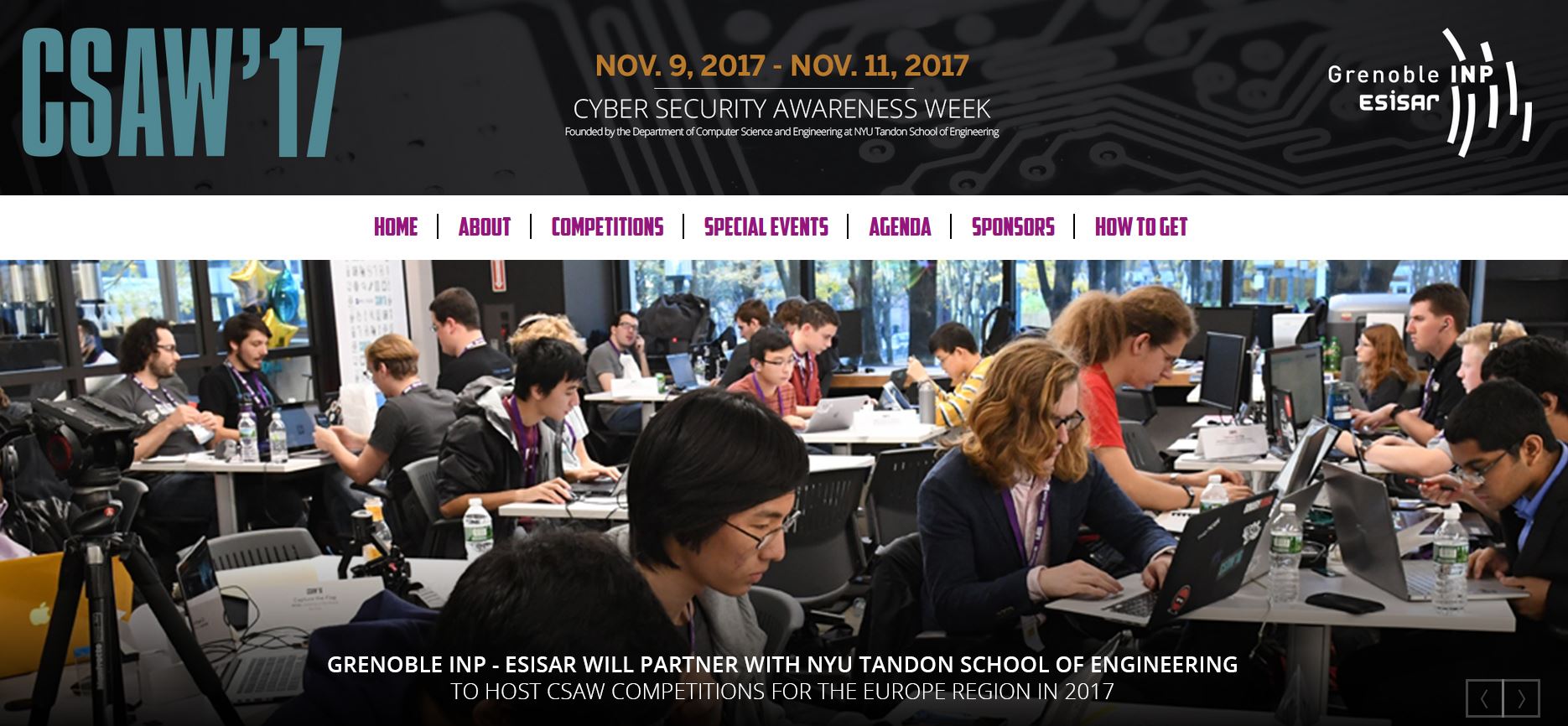 Grenoble INP - Esisar organise en collaboration avec l’Université de New York (NYU), l’édition européenne du Cyber Security Awareness Week (CSAW), du 9 au 11 Novembre 2017, au sein de l’Esisar à Valence, France.