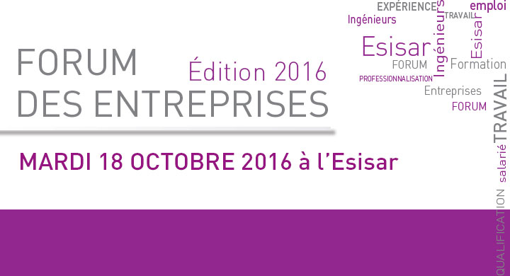 Mardi 18 octobre, de 13h30 à 18h30, se tient dans les locaux de l'école le forum des entreprises destiné aux étudiants de 5ème année en recherche de projet de fin d’études ainsi qu'aux étudiants de 2ème ou 3ème années en recherche d'un stage technicien. Les jeunes diplômés, les apprentis ainsi que les étudiants de 4ème année sont également les bienvenus.