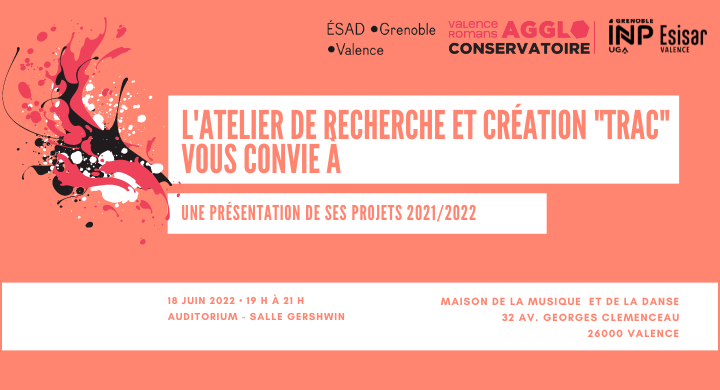 L’atelier de Recherche et Création « TRAC » vous présente ses projets réalisés par les étudiants tout au long de cette année à la maison de la musique et de la danse de Valence, le 18 juin de 19h à 21h dans la salle Gershwin et dans l’Auditorium.