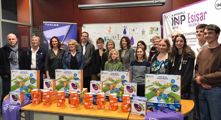 Les différents intervenants, Audrey Guilloton, directeurs d'école élementaire, étudiants de l'Esisar et la société Thales qui financent les kits, posent lors de la remise des kits.