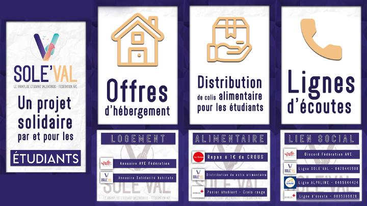 De nombreuses actions ont été menées depuis octobre : soirées d'échanges et d'activités Valence en ligne, serveurs de discussion, entraide, écoute des étudiants, organisation de petites actions par les BDE en interne selon protocole sanitaire... mais ne pouvant contrer cette dégradation uniquement en distanciel. Ainsi, dans une période où les présidences d'universités et de différents établissements se tournent vers leurs associations étudiantes pour participer à la réponse à une détresse étudiante dont la médiatisation a connu une grande avancée au mois de janvier, SOLE'VAL s'appuie avant tout sur la grande proximité de nos associations avec les étudiants pour être efficaces sur le dernier maillon le plus délicat : celui de toucher, en bout de chaîne, le plus grand nombre.