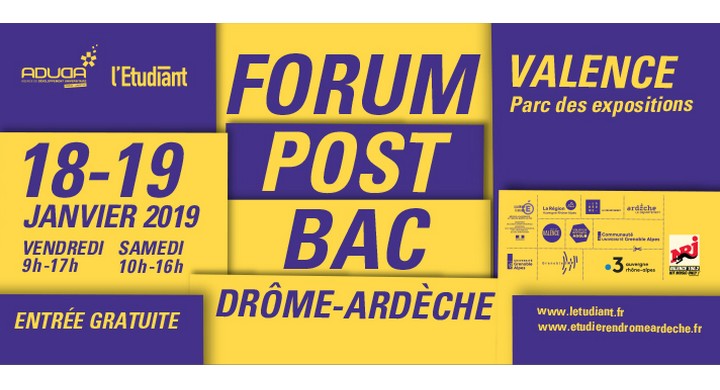 Le Forum Post-Bac Drôme-Ardèche, c'est le 1er salon de l'étudiant GRATUIT en Sud Rhône-Alpes, ouvert à tous les lycéens, étudiants et à leurs parents, pour guider leurs choix d’orientation. Il rassemble plus de 120 exposants venus présenter plus de 160 formations universitaires, en alternance et en apprentissage, des écoles d'ingénieur, des classes préparatoires et autres écoles spécialisées.